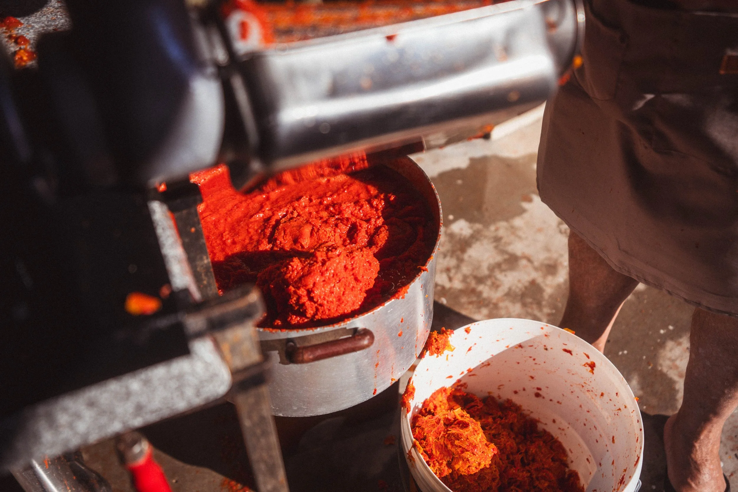 Tomatoes boiled, they are transferred over to the garage, where, alongside the 100l barrel of wine he’d made the day prior, we begin the task of churning them into a deliciously thick, rich tomato sauce.